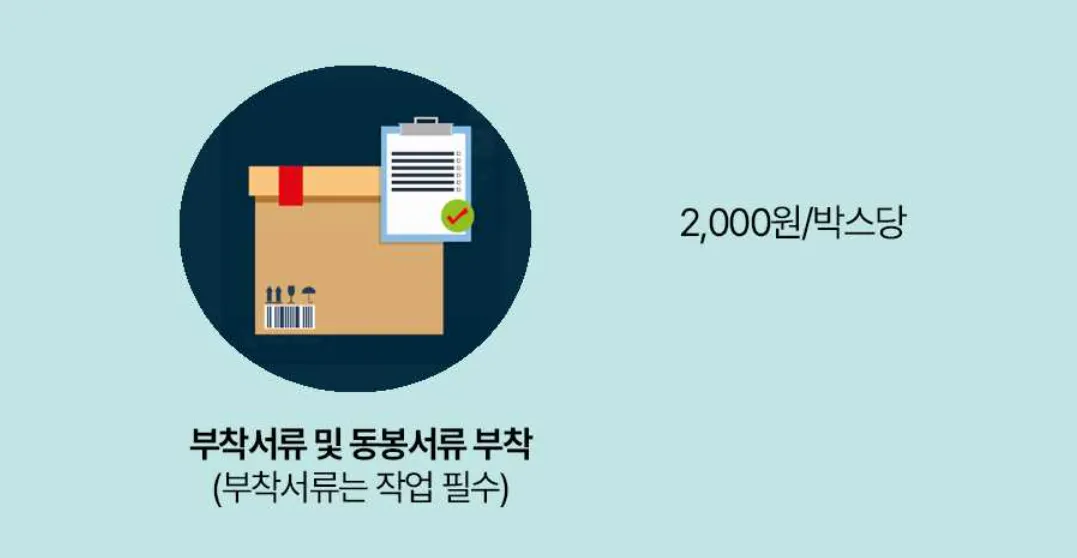부착서류 및 동봉서류 부착 | 2,000원/박스당 | ○ | ○ | ○ | ○ | ○ | 부착서류는 필수 작업 |