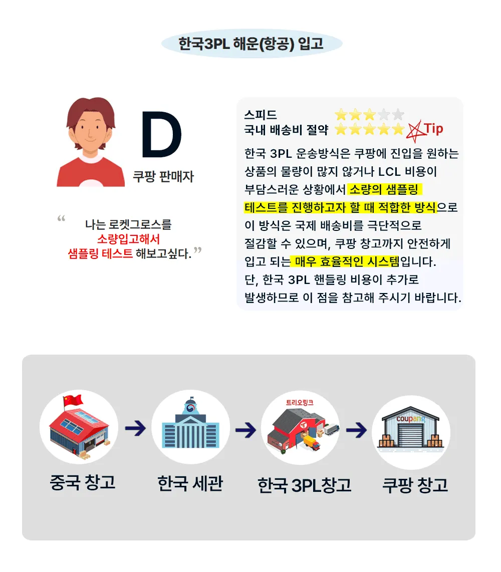 다만, 한국 3PL창고를 들렸다가 쿠팡창고로 입고되는 방식이라서 물류비가 한번 더 발생됩니다.