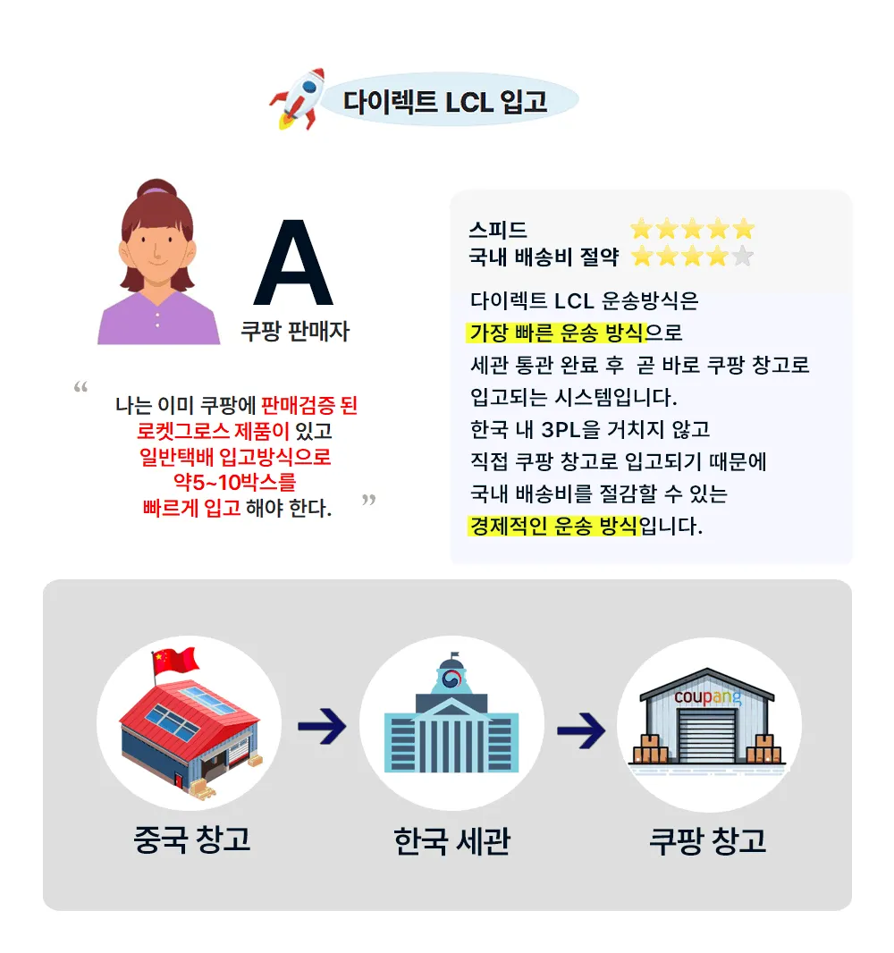 로켓 다이렉트 입고(LCL): LCL로 중국창고에서 쿠팡창고로 바로 입고되는 방식입니다.