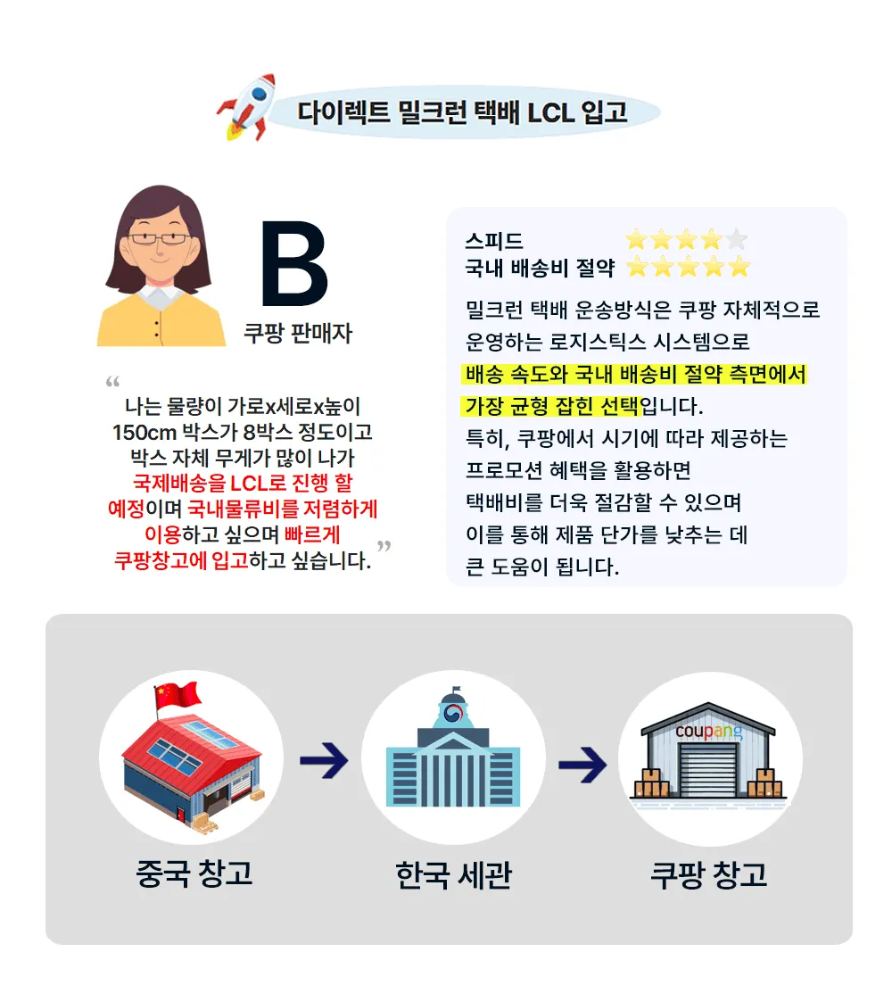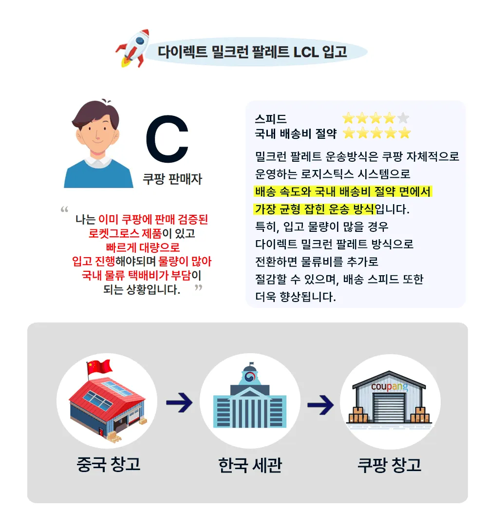 로켓 다이렉트 밀크런 입고( LCL ) : LCL로 중국창고에서 쿠팡창고로(밀크런 방식) 바로 입고되는 방식입니다.