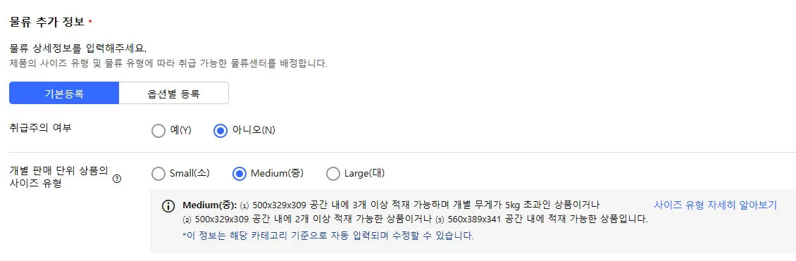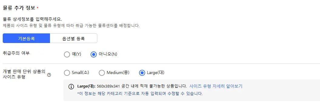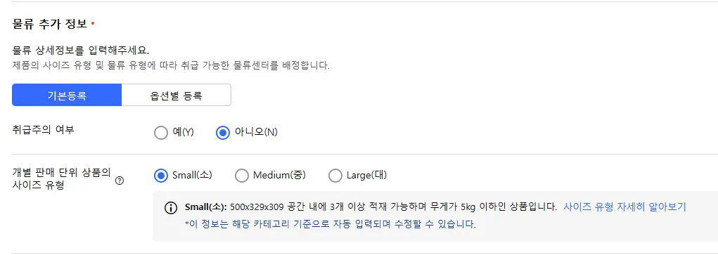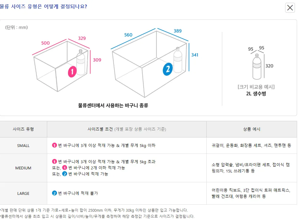 쿠팡창고 입고 시 제품 사이즈마다 물류창고 주소가 달라 집니다.