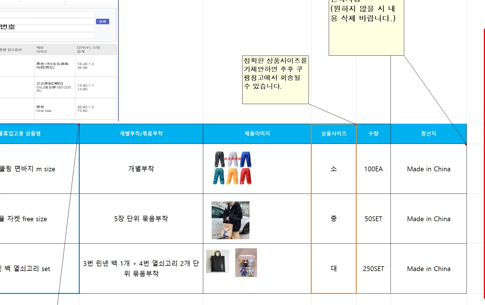 다양한 사이즈의 제품들을 한 주문서에 작성하면 트리오링크 창고에서는 제품 사이즈별로 박스에 마킹을 해서 별도 관리를 해야지만 추후 한국에서 통관 완료 후 사이즈별로 분리해서 각 쿠팡창고로 입고가 됩니다.